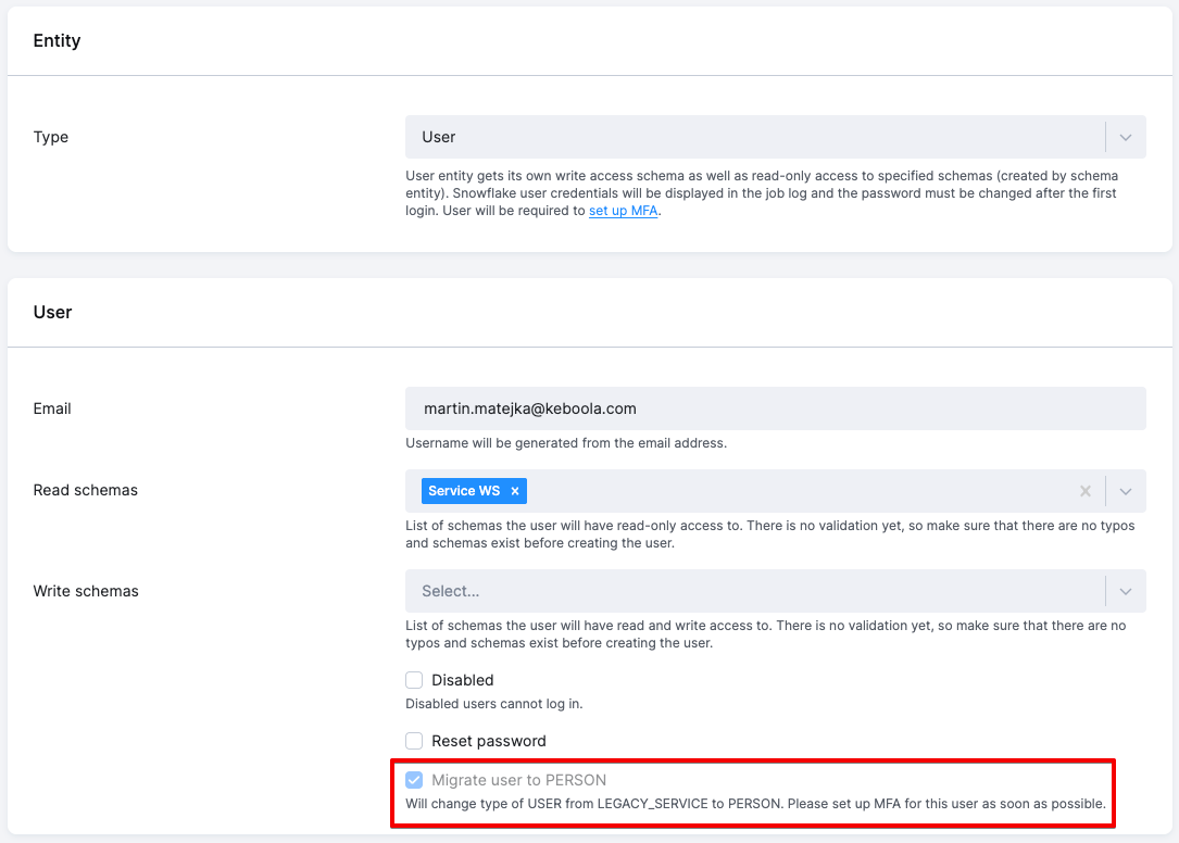Migrate user to PERSONflag is set to true and the component is run, the database user will be migrated fromLegacy ServicetoPerson. After migration, setting up MFA is mandatory upon first login to the Snowflake UI. - If the flag is not set to true, a