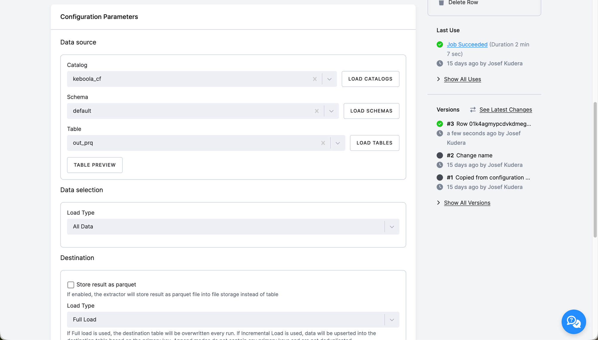 - Flexible data selection: Extract full tables, select specific columns, or use custom SQL queries.