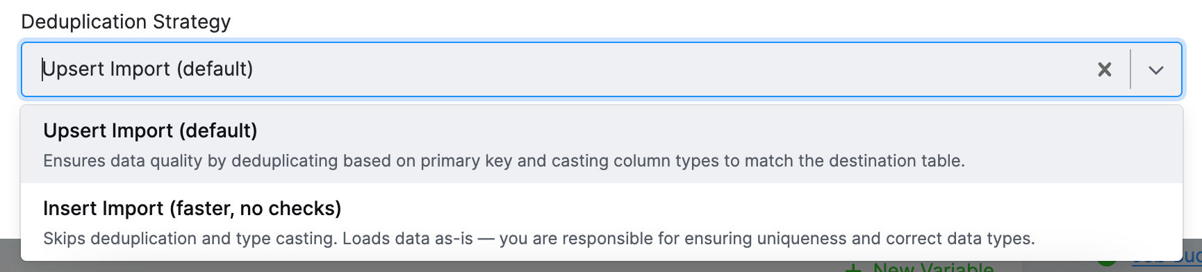 The new logic replaces complex branching with a simplified execution path. When enabled, you can configure the Output Mapping in Transformations to use Insert instead of the default Upsert. This significantly speeds up data loads by skipping deduplication and type casting, making it ideal for large datasets where performance is critical.