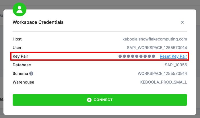 If the key needs to be reset later, users can do so via the Credentials dialog, accessible under the Connect button: