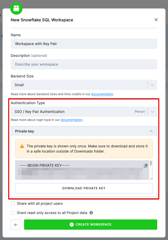 The required Private Key for Key Pair authentication can be generated and downloaded immediately during the workspace creation process: