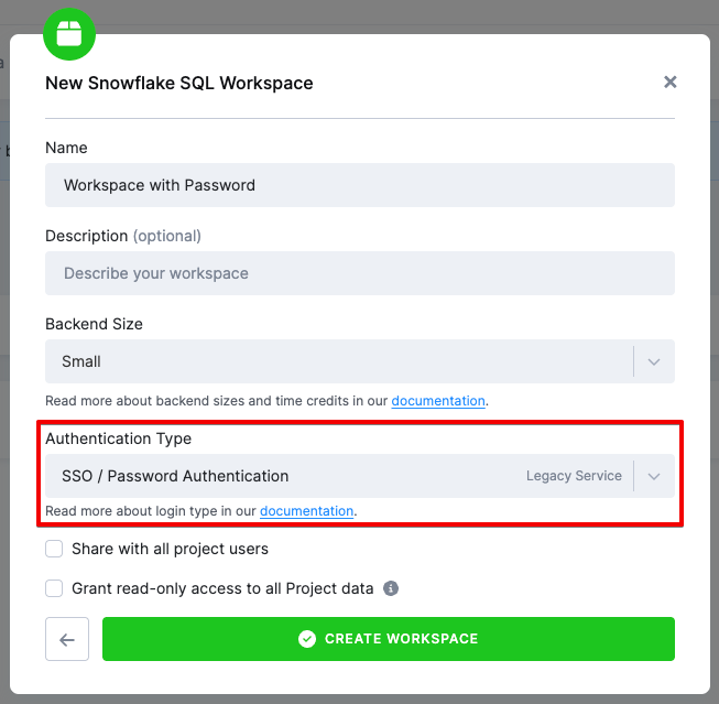 Users can now choose the authentication type when creating a Snowflake SQL workspace. Specifically, they can create new Person type workspace, which supports: