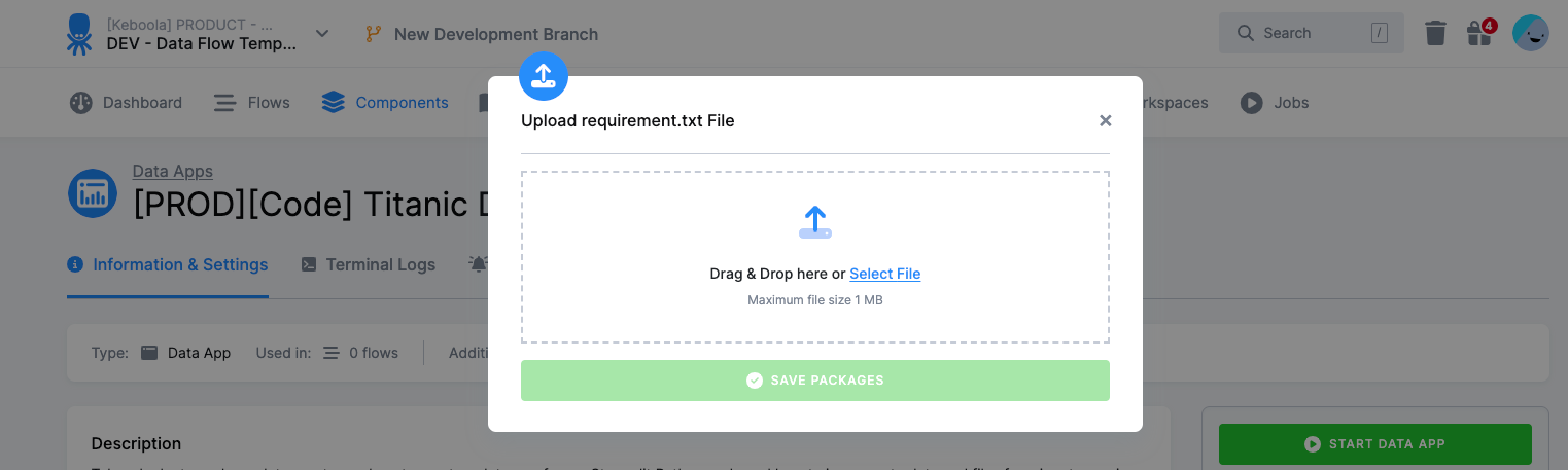 pip freeze > requirements.txt - Upload it through the Keboola UI before deploying your app