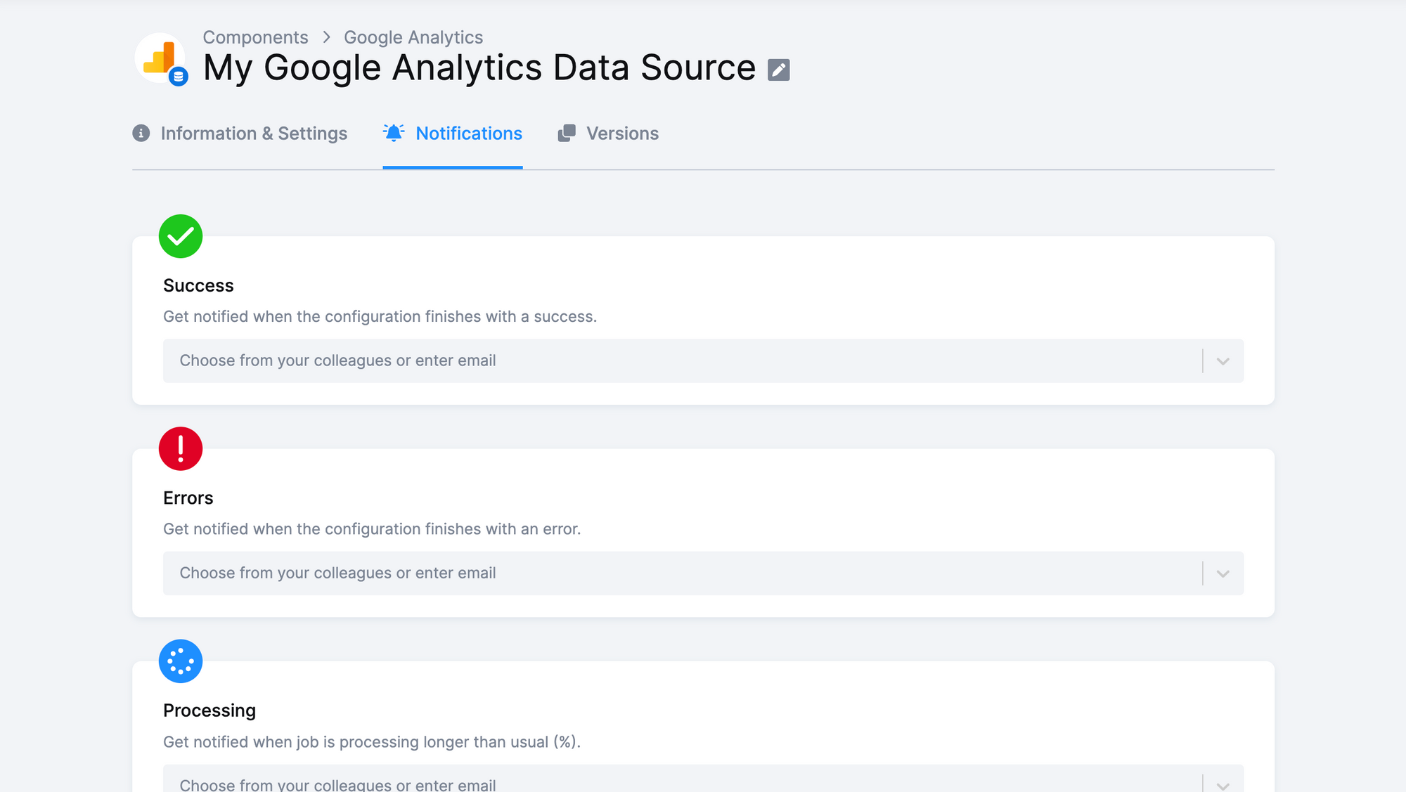 If you are on a project with Queue v2, you can now set notifications for all components, the same as in Flows. To put it simply, whether a configuration run ended with an error or finished successfully, an email can be sent. If you want to be notified about a longer run, that can be set up too.