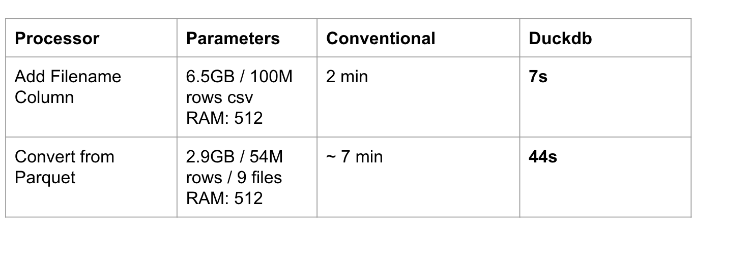 One of the biggest advantages of DuckDB is its performance. Compared to single-purpose processors, it is much faster. You’ll see even greater time savings when replacing a chain of old processors with a single DuckDB configuration.
