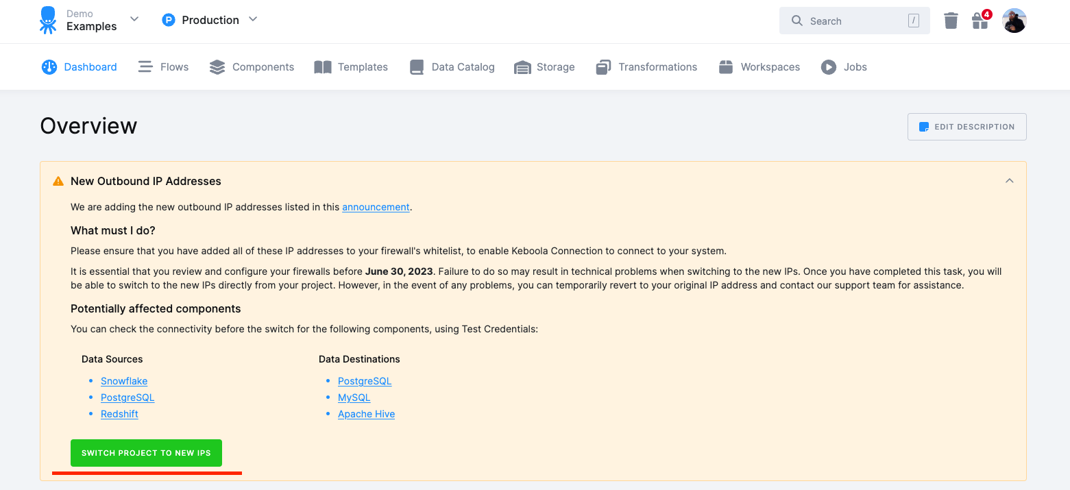Please note that if you have not manually updated your whitelist by the deadline, Keboola will perform the switch globally. This means that your projects will be automatically switched to the new IP addresses after June 30, 2023.