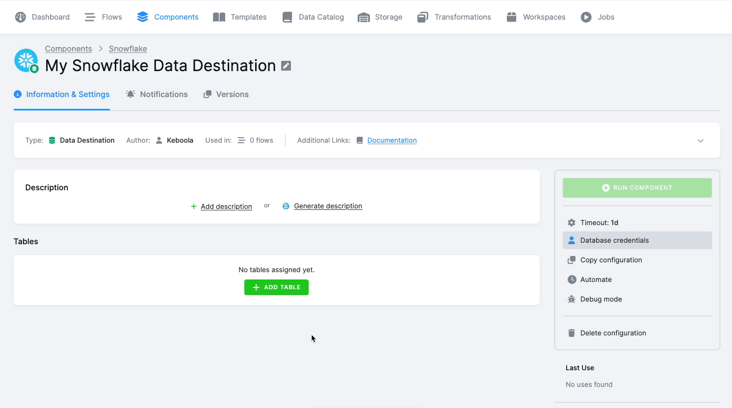 To simplify access to database credentials for Keboola-provisioned databases, we’ve removed the need to navigate to a separate credentials page. Instead, credentials are now shown in a modal directly within the component’s configuration interface.
