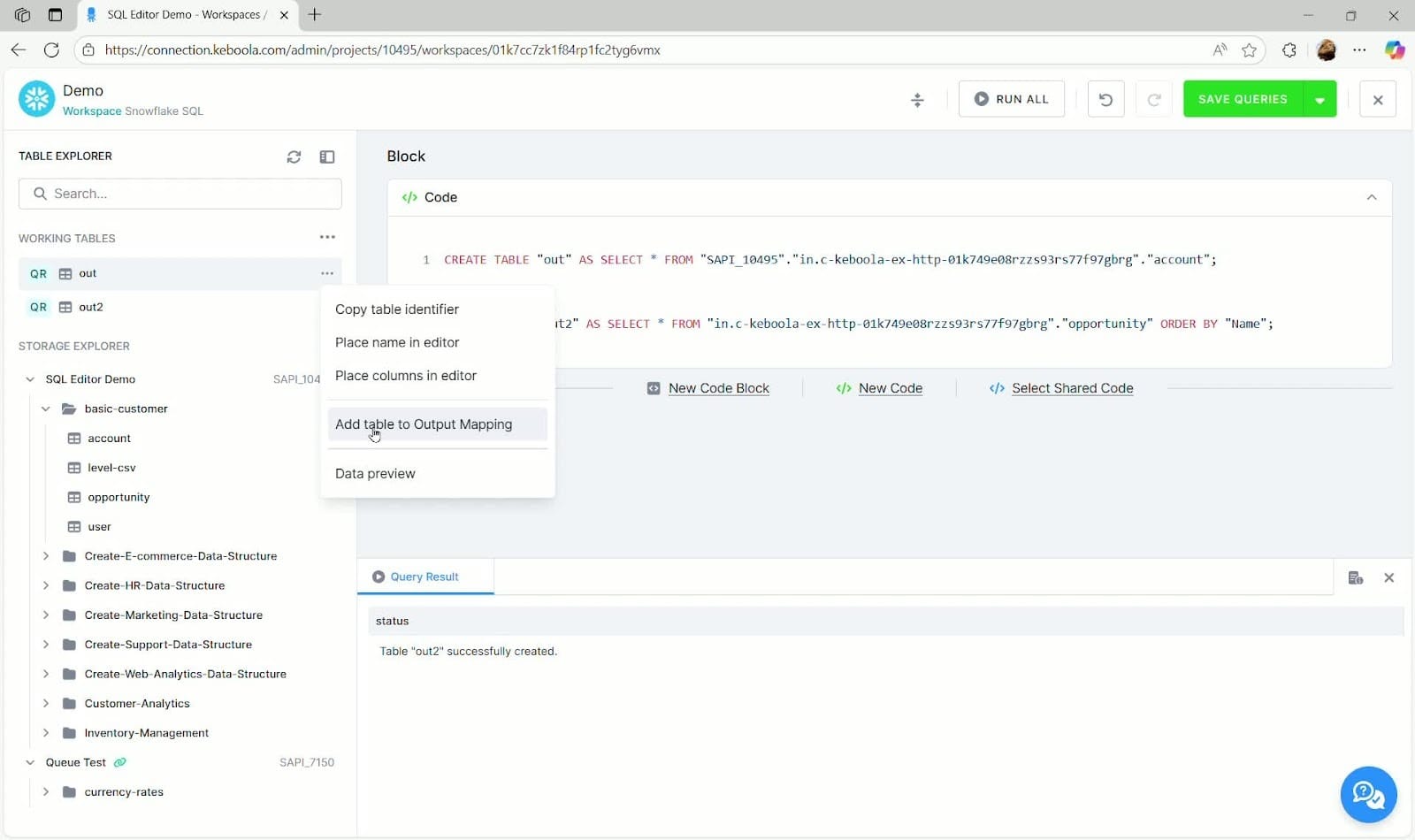 Transformations & Output Mapping: Convert queries into persistent tables and map them to Keboola Storage. Configure primary keys, incremental loads, and save queries as formal transformation components.